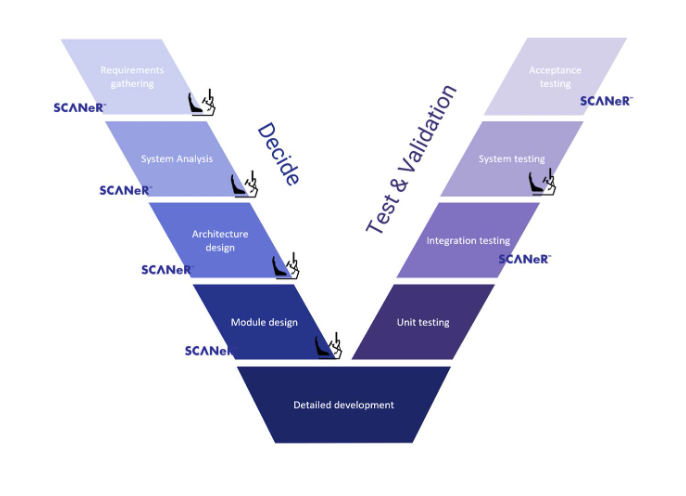 SCANeR 可在 V-周期(需求分析到验收测试)的所有阶段使用。例如,对于需要决定是否制作原型的设计团队,SCANeR 的高真实感可帮助消除对原型或设计概念的疑虑,从而决定是否进一步开发。另一方面,SCANeR 也可用于 HILS 或 VILS 测试台的测试,实时性可支持车辆策略和传感器功能验证。