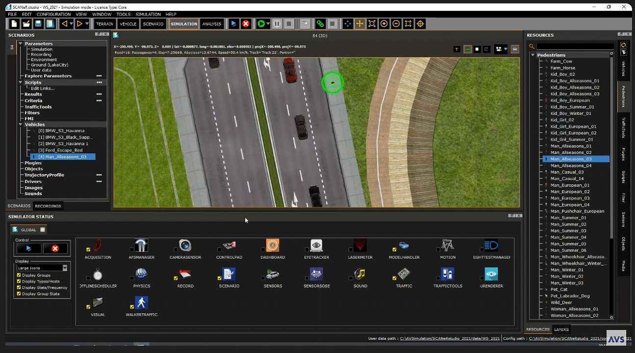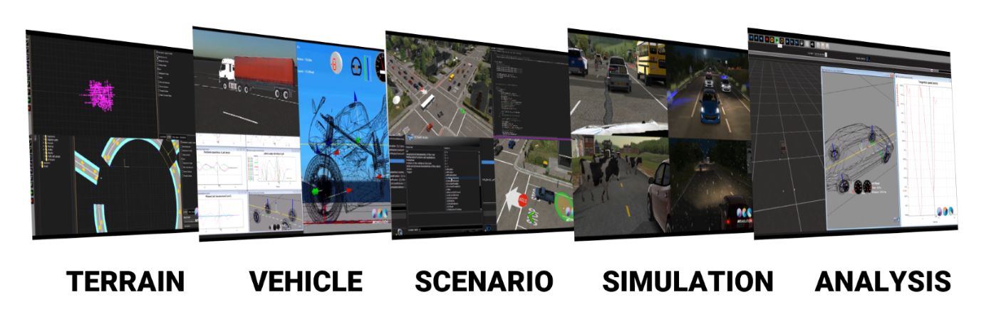 SCANeR 基础功能已经包含五个功能模块供用户自由使用,除部分功能外,所有模块均可免费使用。5个功能模块分别是TERRAIN(道路环境构建)、VEHICLE(车辆创建)、SCENARIO(场景创建)、SIMULATION(仿真执行)、ANALYSIS(数据分析)